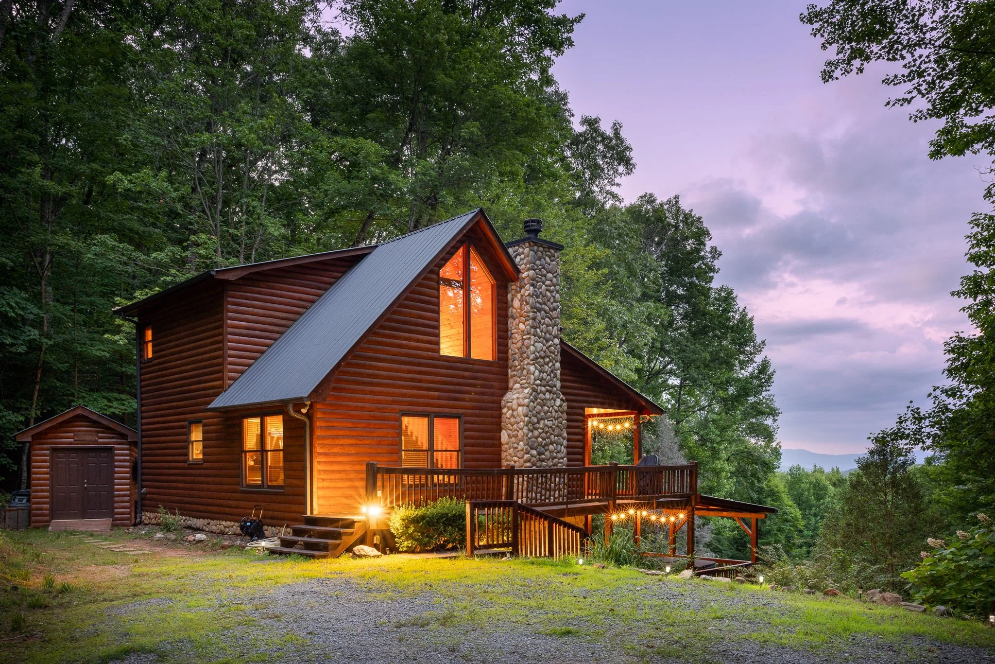 Welcome to Moonrise. Situated upon a ridge of Prince Mountain with long range views to the East, this well appointed chalet holds a plethora of unique amenities. The property, just shy of 5 acres, borders USNF with tons of privacy and no visible neighbors. A quick 1.3 miles down the road brings you to Fightingtown Creek Nature Park with 190 acres and 12+ miles of mixed use hiking and cycling trails.. Downtown Blue Ridge is only 8 miles away. The freshly renovated interior boasts a great room featuring a beautiful stacked stone fireplace, creating a warm and inviting atmosphere. The spacious upstairs primary suite with a private balcony holds breathtaking mountain views. Step outside onto one of the cabin's three levels of decks for dinner with friends or relax in the hot tub with a cool mountain breeze on your face. The separate multi-use structure is perfect for the kids' treehouse or a yoga studio. There is too much to love about this home perched in serene beauty.